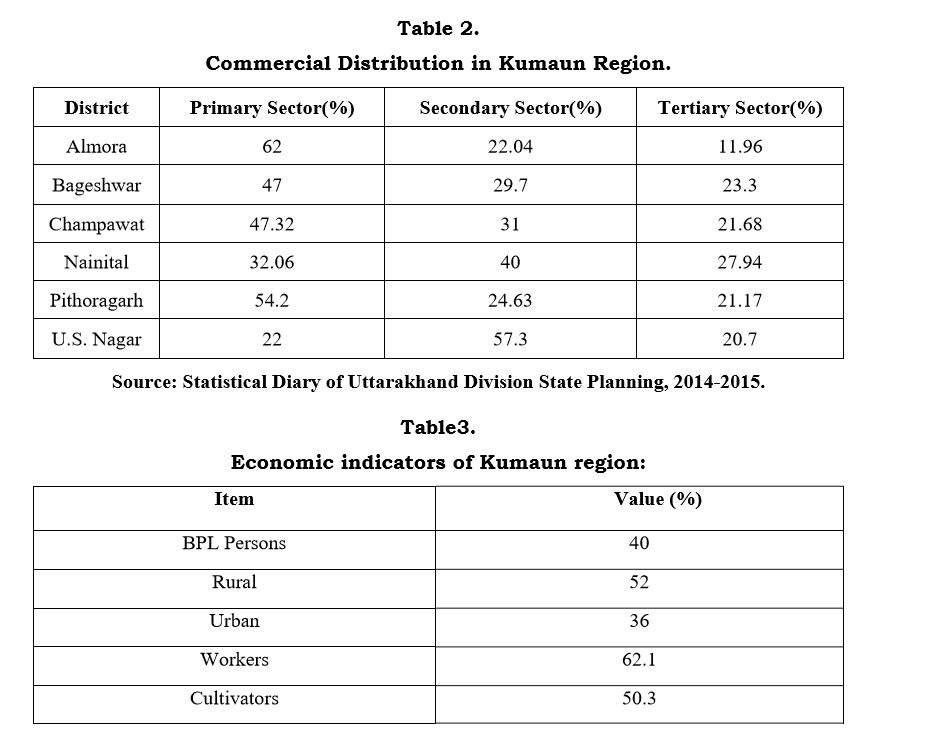 Long awaited development in the hill districts of Kumaun region has pushed backward the development of these districts relatively to the other plain districts of Kumaun region. This has resulted in the persistent migrations of the major workforce from these districts which largely constitutes the male youths of these regions. This has put pressure on the economy of these districts. We see that the Kumaun is primarily depends upon agriculture, but there are many industries, which contribute in the economy, we know that the all these industries were established in plain areas or we can say in plains areas in the Kumaun region. We see in this paper that as 86% o the state consists of hills region in Kumaun area and only some of agriculture products like wheat, rice and potato are the key products of Uttarakhand. We know that agriculture has to be among the top contributors of revenue in Kumaun region from tabulation in this paper, but only some of the products are involve in agriculture. This means villages that have witnessed migration in the recent past now have to deal with several plots of untended land interspersed with active farmland.