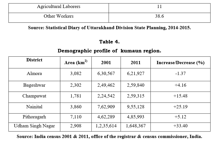 The occupational distribution of workers is the most important determinant of social, economic, as well as environmental development of Kumaun region. The larger part of the Kumaun region is characterized by a difficult terrain, undoubting topography, remote and inaccessible villages, spare population, tiny land holders, agriculture based economy and weak infrastructure in hill areas. Though, the region is rich in beauty and natural resources, improper use of these resources and rapidly growing population has thwarted its development and consequently the Kumaun region is technically backwards and economically poor.