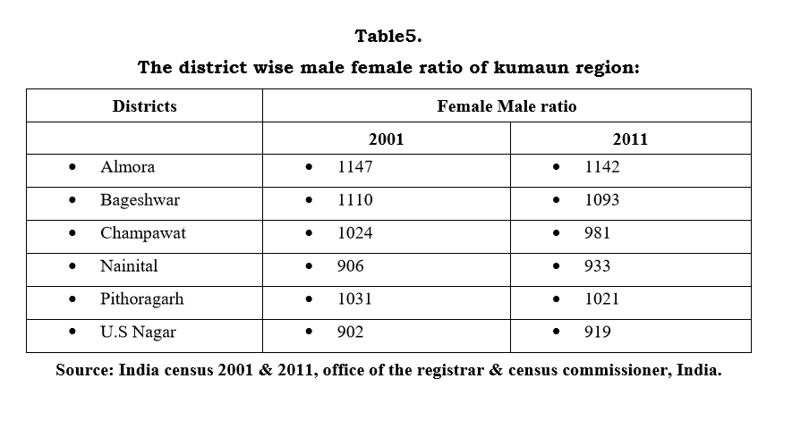 The above table reveals that the sex ratio has decreased in all the hill districts and increased in the plains of the Kumaun region. Champawat district shows a higher decline in the sex ratio as compared to the other districts. The main reason behind is the social factor.